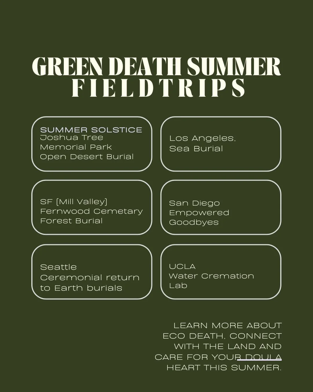 FRIENDS, I sit in winter reflection after my first year on this journey as a death doula. I was reminded of my “why” in choosing this field after gathering family for our wedding this past month. My 94 year old grandmother out partied my pregnant ass one night. I am beyond blessed that she and both my parents and even all of their siblings are dancing earthside right now. I’m in no rush to put my training to practice on my own family. I don’t get to choose when I will be called to service in that way, but I stay educated and active in community. I began the first quarter of this year building a coworking space in a death studio. I got to meet with some passionate individuals in death tech, grief circles, and adjacent wellness academics that led to creative collaborations. In the second quarter, I ambitiously set off to explore green death in a series of immersive fieldtrips that kicked off at Joshua Tree to learn about open desert burials. And while I rushed to dig into these fieldtrips, I was humbled and slowed down to integrate the depth of the learnings with community. One fieldtrip this quarter was enough. It was enough and it was healing and it was beautiful. Third quarter hit different this year and I peacefully accepted the death of the maiden to welcome the mother. I put a sacred pause on doula work to shift into the full spectrum of birth. This final quarter has already held many reasons for ceremony and celebration of life. And I just attended the EndWell conference again, digitally this time, still as inspiring. I look back on this year and am grateful to have completed my 200 field work hours. I look forward to this unfolding journey as a green doula, in death and in birth. Thank you for staying reverent for all that is natural. And so 2024 was.